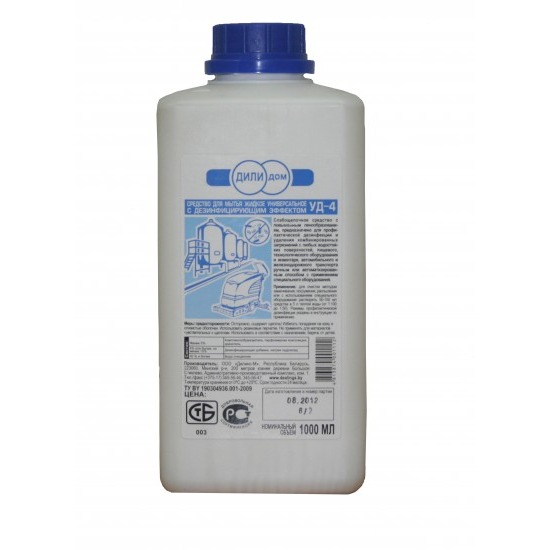 Универсальное жидкое средство для мытья УД- 4 подходит для пенной очистки и обеззараживания поверхностей из любых водостойких поверхностей и материалов в быту, в детских учреждениях, на объектах автомобильного и железнодорожного транспорта, на перерабатывающих предприятиях и предприятиях общественного питания, коммунально-бытового обслуживания, торговли, потребительских рынках, в учреждениях образования, культуры, отдыха, спорта, в учреждениях социального обеспечения и других объектах. Обладает дезинфицирующим эффектом.